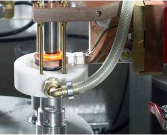 Pájení systémem od společnosti EFD Induction. Všimněte si, jak je zóna ohřevu plně viditelná, což je při pájení plamenem prakticky nemožné.